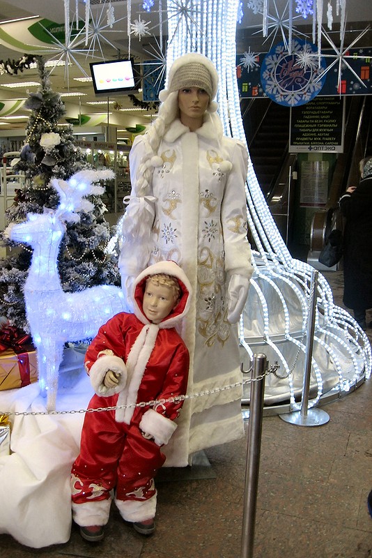 Выступающий с предвыборным обращением новогодним поздравлением Дед Мороз:Внучка его Снегурочка (еще недавно, похоже, стоявшая в купальнике в секции женской одежды)и странный мальчик - наверное, это и есть Новый 2011 Год:А теперь вглядитесь в их лица:
