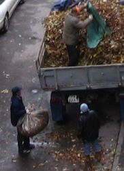 А, ну их потом вываливают в кузов. У нас такие длинные черные мешки, которые сначала, как трупы лежат на газонах, а потом штебелями вывозятся на грузовиках.