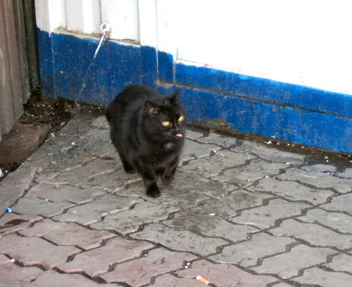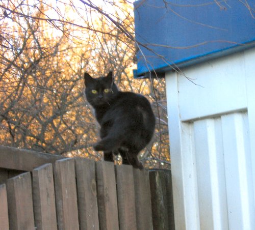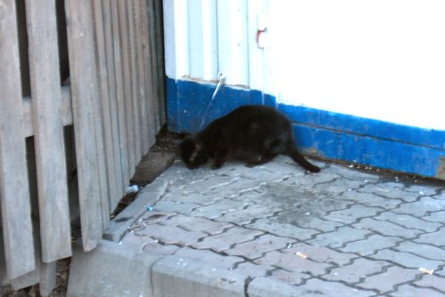 Кот в Большом городе. Вот и покушал Стою на остановке, жду автобуса. Возле киоска сидит черный котик и что-то с аппетитом жрёт.  -Ну что ты прямо как подзаборный,- упрекнул я его. - Подзаборный?!- возмутился он и даже высунул от возмущения язык.  - Я не подзаборный, я назаборный! Хочешь, докажу? И немедленно доказал!  А я от неожиданности снял его со вспышкой, отчего зверь озарился мистическим ореолом. | ||||||||||||||