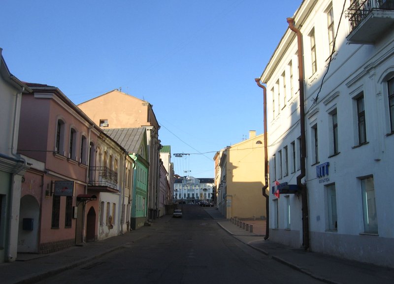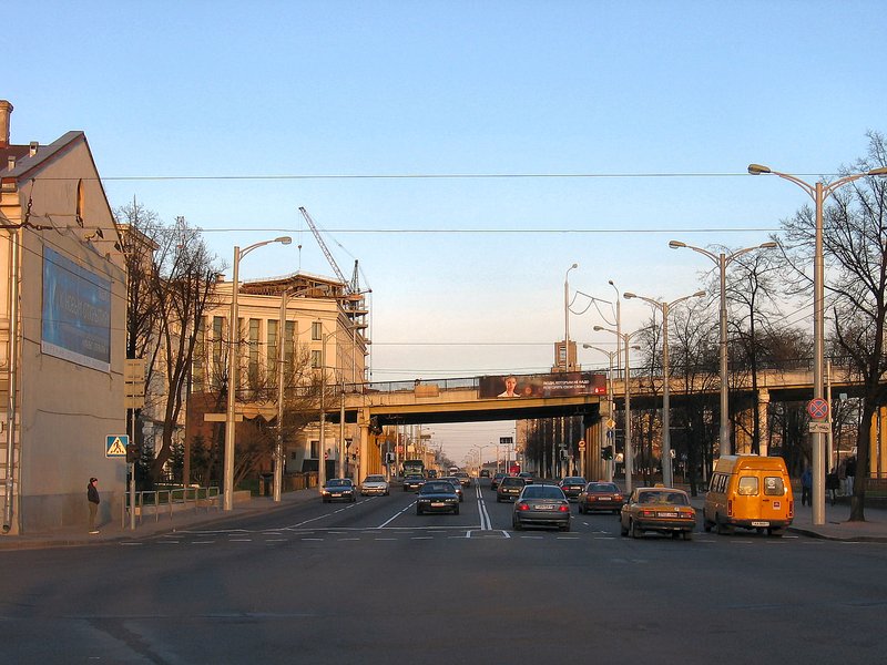 Революционная Когда-то Койдановская, через Романово-Койдановскую (Мясникова) и Койдановский тракт (Чкалова) вела, понятное дело, в Койданово (Дзержинск). Всё переименовали! |  | Берсона Когда-то Трубная. Давно сгинувший ручей ("труба" здесь означала "русло") по этому склону стекал в Немигу, которая течет под землей в паре десятков метров за мной. |  | Бобруйская А вот она всю жизнь Бобруйская. Появилась, когда возникла необходимость соединить Виленский (впереди за мостом) и Московский (за правой рамкой кадра, это нынешняя Товарная станция) вокзалы. |  |