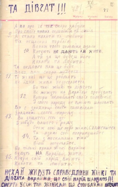 Стало диво в Новосілках На всі села околиці, Взялись пилно за роботу Дівчата та молодиці. Стали гнати самогонку Та нейю впиватися Та стали змоскальами Під плотами вальатися Всі плоти в Новосілках У вечері попідпирали жінками А москальі коло них трутся Як собакі сучками. Завоньав сморід в Новосілках Від бабського та московського поту Бо де не йдеш у вечері То наліжш на купу що лежать коло плоту Засмерділись жінки та дівчата в Новосілках Сталінськими московскіми духами І ходять по Новосілках З великими брухами. А про чоловіка нема коли думати А нащо про його думати З москальами гульають А до чоловіка нема коли листа писати. Обдумайтесь! Жінкі та дівчата Що ви почали робити На що ви сталі З москальами блуд робити. Подумайте де ваши сини чоловікі Як вони сьогодні пропадають Далеко десь на сібірі З голоду вмирають. А ви про їх так скоро забули Про своїх милих чоловіків та синів А стали кохати та любити Тіх нещасних торбаїв. Вониж твого чоловіка взяли Катують не дають їм жити. А ти за це будеш його Кохати та любити. Та недовго вам це буде Воно вам скоро менется Ті жінкі що це робльать Не їдна жива незостанется Бо такі жінкі та дівчата Не можуть на Вкраїні пробувать Котори нелюбльать своїх чоловіків І свого народу не вміють шанувать Ви є зрадниці своїм чоловікам Зрадниці свого народу Ви знщитесь геть усі І небуде вашого і роду Отож покі ще пора жінкі, СХАМЕНІТСЯ Та язикі собі поприкушайте Та з москалями тіми Білш негульайте. Бо тількі кращи жінкі Вкраїни Будуть на Вкраїні жити Котри свій нарід вміють Кохати та любити. НЕХАЙ ЖИВУТЬ СПРАВЕДЛИВІ ЖІНКІ ТА ДІВЧАТА ВКРАЇНИ, ЩО СВІЙ НАРІД ШАНУЮТЬ!!! СМЕРТЬ УСІМ ТІМ ЖІНКАМ ЩО СТОРБАЯМИ НОЧУЮТ Джерело: http://www.archives.gov.ua/ - Державний комітет архівів України.