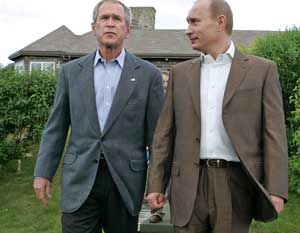 Танцуйте казачок и все будет хорошо... Уф... Уезжал из Софии на несколько дней по делам. Вернулся - у нас дождь и холодрыга. Батареи отключили. На улице плюс четыре. А в Москве вроде будет плюс 18. Настроения мало, сел читать газеты. А там пишут, как Путин и Буш вчера танцевали казачок. Стал смотреть на фотографию президентов. Какие они смелые, сильные, Буш, сразу видно, и дальше готов защищать мир во всем мире, а Путинька веселый, радуется, что покушал и потанцевал. Приложил руки к монитору и стал заряжаться от фотки положительной энергией. Надо будет ее скопировать и почаще рассматривать.Только вот казачок танцевать не буду, неумеха я в этих делах...  Фото из Газеты.ру | 11:24a |