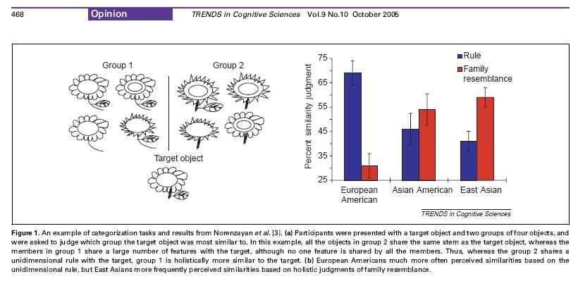 Westerners tend to attribute events to causes internal to the object or person whereas Asians are more likely than Westerners to attribute causality to the context or situation [1,2]. Westerners are more likely to use categorization and rules in reasoning about everyday life events whereas East Asians are more likely to emphasize relationships and similarities [3]. Richard E. Nisbett and Yuri Miyamoto. The influence of culture: holistic versus analytic perception. Trends in Cognitive Sciences. Vol.9 No.10 October 2005
