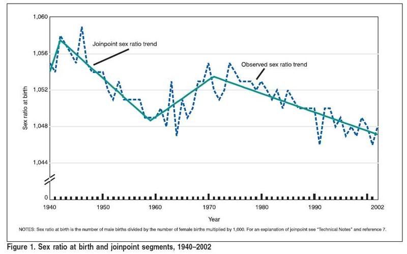 Хотел посмотреть, как влияет избыток женщин/мужчин в NY/SFBA на рождаемость, но данные пока не нашел. Зато есть статистика по всей Америке. Четко виден пик 2-й мировой и рост соотношения после войны во Вьетнаме.