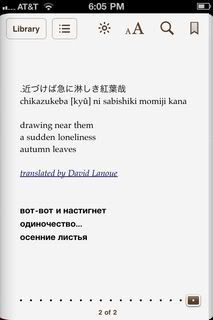 Оказывается, это проще простого - сделать электронную книжку в формате e-pub для iPhone и других телефонов. Наверное, к августу сделаю что-то вроде 100 хайку Иссы, с японским, английским (если Дэвид Лану разрешит) и русским текстaми. Хорошо бы картинки какие-нибудь найти. или фотографии, чтобы не так тоскливо было :)