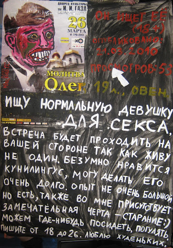 Серия "Несерьезные знакомства" - "Олег, 19 л.", 163Х117, афиша, бумага, акрил, текст с доски объявлений в интернете