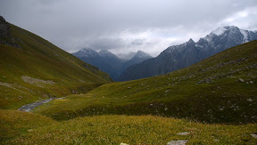 Завтракаем; дождь постепенно почти прекращается. В просвете мироздание показывает нам Аксуйскую стену. Оно дразнится! Решаем, что туда не пойдём, а пойдём на Алакёль. Спускаемся вниз по долине Алтын-Арашана.