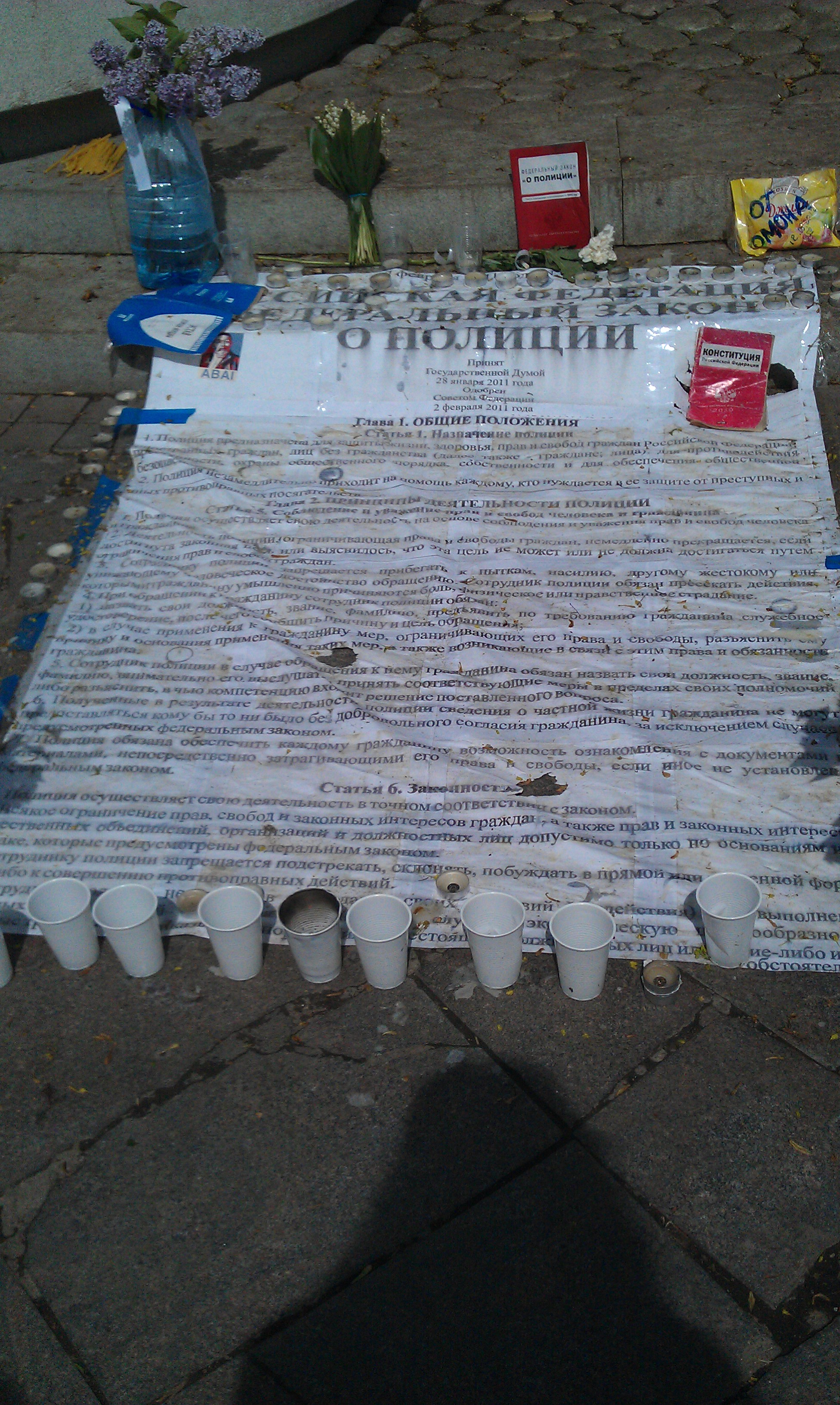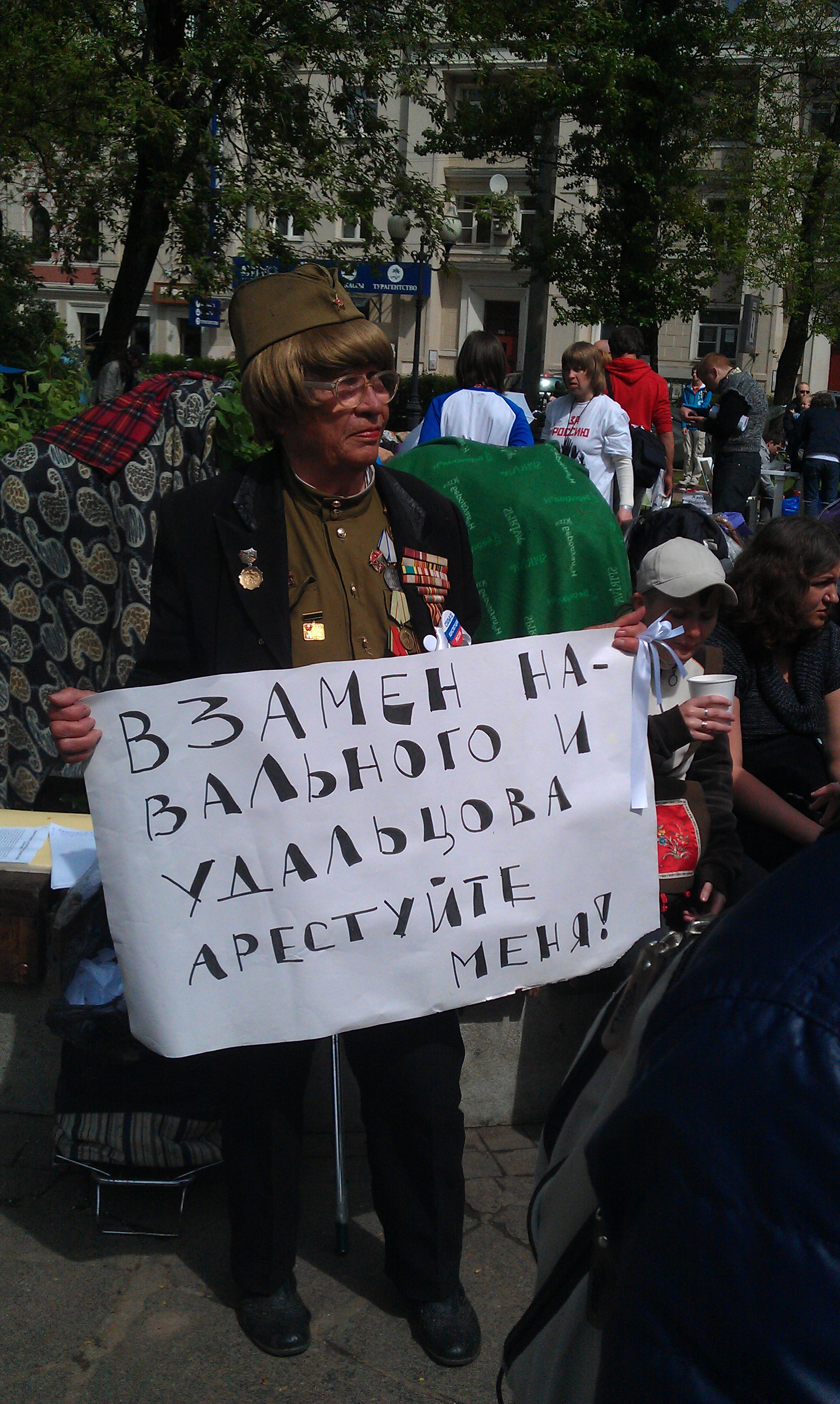 Была около часа дня "у Абая"; видела, как мирные народы пасутся там в ожидании, что к ним придет революция. Люди милые, подростки играют на гитарах и поют что-то вроде Башлачева по звучанию, но по содержанию противоположное. Веселая тетка раздавала белые ленточки, и была так-то трезвая, но ее пьянила революционная борьба. Она спрашивала: "И вы не боитесь?! И вы не боитесь?!" -- у тех, кто ленточки брал, и говорила: "Здесь -- лучшие люди России! А скоро здесь вообще будут все лучшие люди России!"