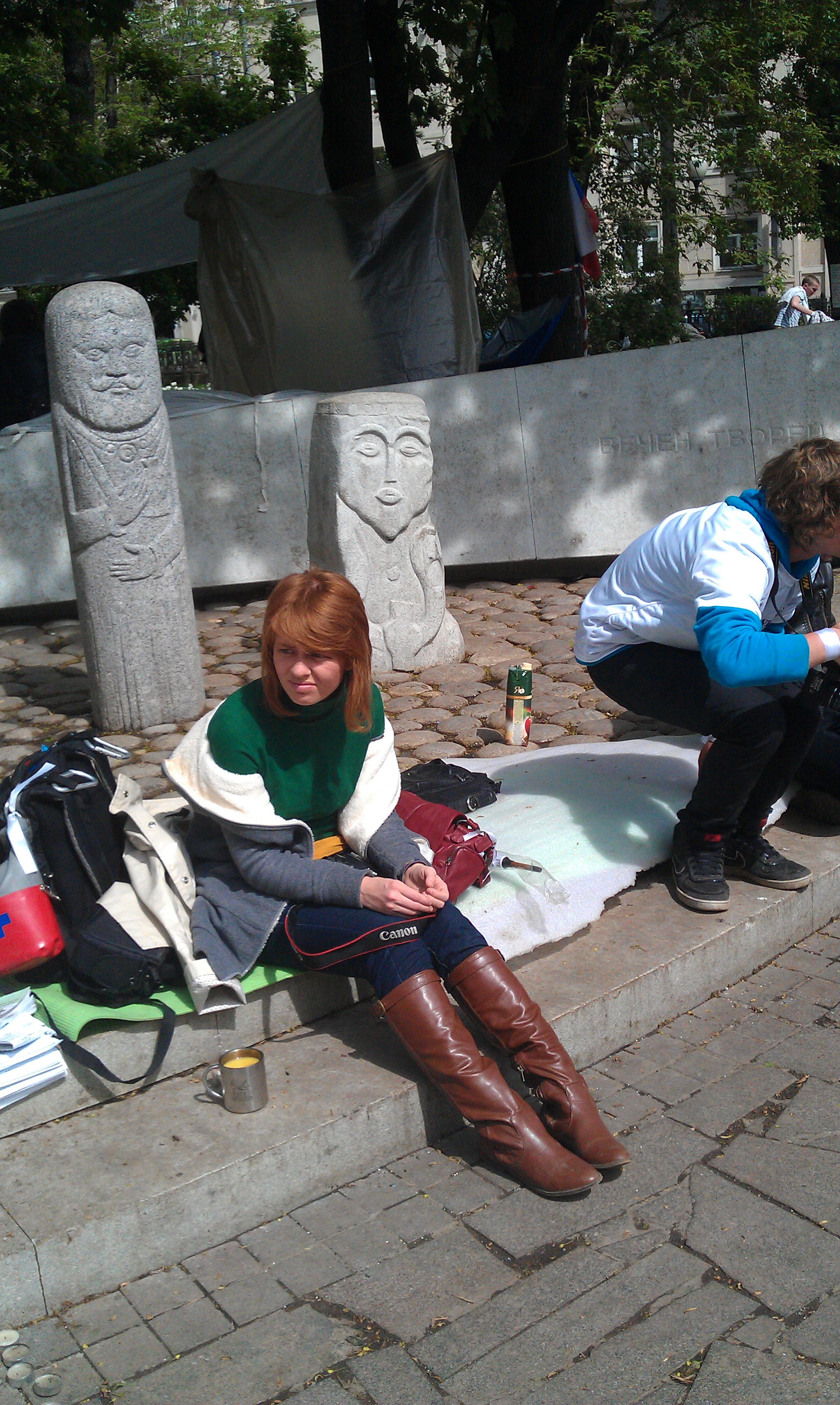 Пришлось возвращаться, потому что так далеко провокационные отряды вряд ли стали бы скрываться. У Абая счастье уже настало, там и правда были тысячные толпы. Все они уговаривали друг друга не ходить по газонам и не мусорить, но на газоны все же толпа неминуемо выплевывала людей. Стояли терпеливые пропагандистские элементы, подняв кверху брошюру "Вопросы национализма" -- или, кажется, это журнал. Рядом с ними происходило хоровое пение. Интеллигентные женщины средних лет, руководимые двумя дядями с музыкальными инструментами, спели сначала "Ты меня ждешь, и у детской кроватки не спишь..." -- а потом, не сходя с места (впрочем, куда там сойдешь) -- про то, как "шаланды, полные кефали, в Одессу Костя привозил, и все биндюжники вставали, когда в пивную он входил". Где-то как-то так я всегда представляла себе самый страшный кошмар русского националиста. Но времена изменились, да и в людях сейчас нет той нежной ранимости, что была раньше -- все тренированные.