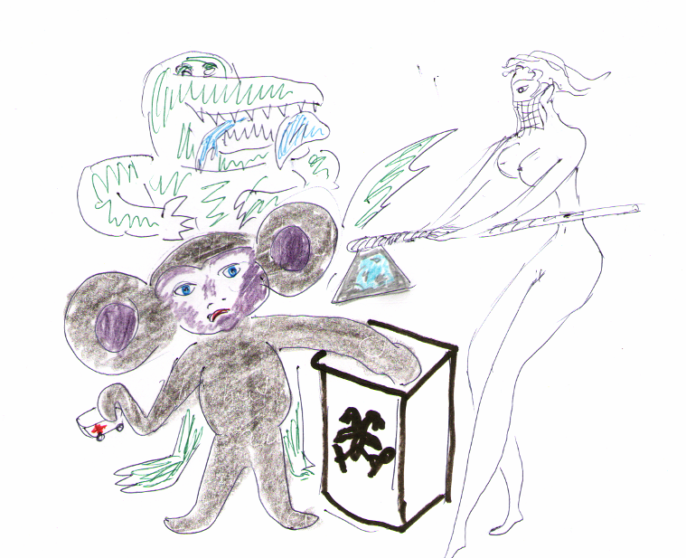 Картина художника. На картине вы видите, как Наташа М. примеривается для ампутации Чебурашке руки до локтя. Чебурашка хотел бы выпустить из руки машинку скорой помощи для облегчения ампутации, но его пальцы крепко сжаты. Принято решение превентивно отрубить другую руку в расчете, что там будет видно. Крокодил Гена в порядке протеста против локдаунов питается масками и перчатками, хотя предпочел бы калоши, но почта их не доставила. На Наташе М. надета маска с целью соблюдения социальной дистанции.