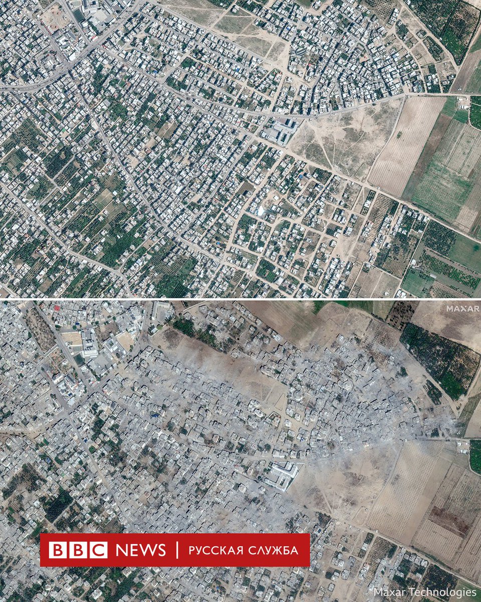 По спутниковым снимкам компании MAXAR можно увидеть масштаб разрушений в секторе Газа в результате авиаударов Израиля, нанесенных после нападения боевиков 7 октября.