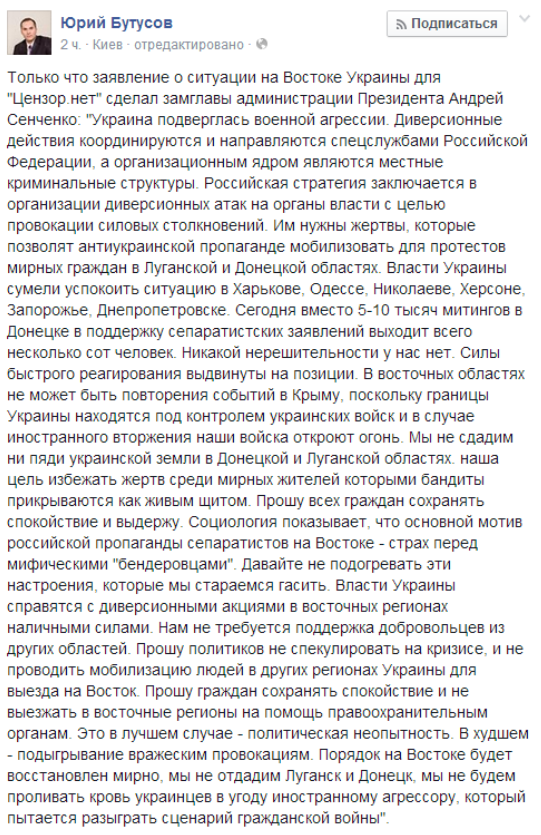 "России надо либо больше чем Донецкий и Луганский регионы, либо просто побузить." России не надо присоединять восточные регионы, так как она надорвется их кормить. Им надо чтобы у власти в Украине были свои ставленники, а Майдан уничтожить. Если они посадят во власти своего человека, то майдановцев начнут убивать и сажать.