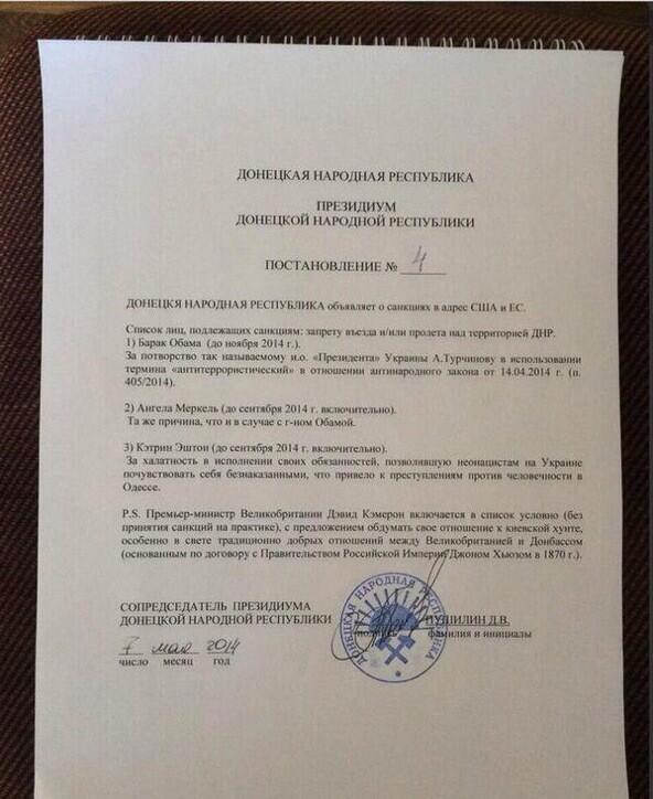 После "референдума", "культурной" программы и, очевидно, банкета, на котором подавались горячительные напитки и грибные закуски, смотрящие ДНР объявили о санкциях против США и ЕС: запретили въезд и "пролёт" над территорией Обаме, Меркель и Эштон. По отношению к Кэмерону ограничились строгим предупреждением, "поставили на вид", так сказать. https://pbs.twimg.com/media/Bngls-fCEAA_yN8.jpg:large