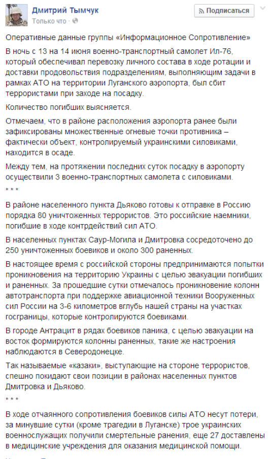 В районе населенного пункта Дьяково готовы к отправке в Россию порядка 80 уничтоженных террористов. В населенных пунктах Саур-Могила и Дмитровка сосредоточено еще до 250 уничтоженных боевиков и около 300 раненных. В настоящее время с российской стороны предпринимаются попытки проникновения на территорию Украины с целью эвакуации погибших и раненных. За прошедшие сутки отмечалось проникновение колонн автотранспорта при поддержке авиационной техники Вооруженных сил России на 3-6 километров вглубь нашей страны на участках госграницы, которые контролируются боевиками. https://www.facebook.com/dmitry.tymchuk/posts/512392362222757