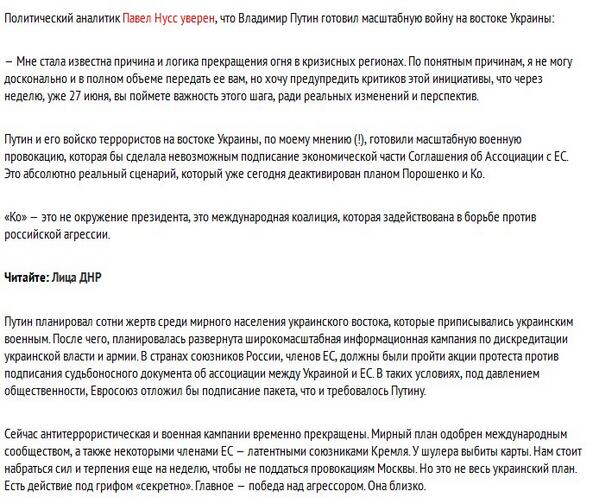 На мой взгляд самый адекватный из них - Кравчук. Хотя письмо имеет только задоприкрывательный смысл, на события оно конечно не повлияет. Путин ни на день, ни на час не оставляет в покое Украину, даже после объявления Порошенко о прекращения огня. Сейчас активно идут вбросы о том, что украинцы стали обстреливать территорию России. Сегодняшнее выступлнение Путина: "К сожалению, то, что мы фиксируем с помощью объективных средств контроля, говорит о том, что боевые действия не прекращаются, и сегодня ночью мы увидели достаточно активную работу артиллерии с украинской стороны. Я не берусь сказать, кто это делает: то ли это регулярная армия, то ли это так называемые вооруженные формирования каких-то "правых сил" - но это происходит". Главное для украинцев сейчас - не реагировать на эти словесные провокации, игнорировать их и выдержать неделю без стрельбы.