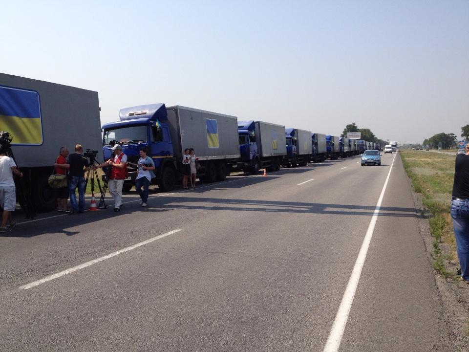 Украинская гуманитарная колонна на Донбассе.  Насколько я знаю, колоннны идут из Харькова, Днепропетровска, Киева. Колонны идут до Старобельска, где их принимают работники Красного Креста. Именно для этих колонн и предлагали РФ сдать продукты.