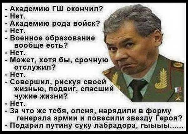 Шойгу выглядит всегда очень злым и глупым - у него вид алкаша который одевается в парадный костюм каждый раз когда выходит на улицу стрельнуть мелочи на водку. У нас во дворе такой ходит один похожий. Очень злые и одновременно глупые глаза - страшная смесь для министра обороны ЯД. А уж эти его голубоустричные дела с формой МЧС - выдают с головой необразованного колхозника допущенного до.