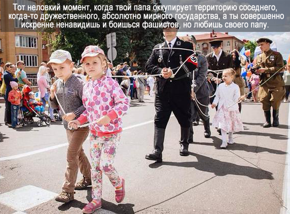 Там дети от возраста младенцев. Самое страшное-это дети от 3 лет. У них детские воспоминания начнутся с формы, хотьбы строем, оружия и пропаганды войны. Этим детям никто не сказал, что война закончилась 70 лет назад, их одели в форму, вбили в голову "кричалку" о победе, сунули в руки игрушечный автомат (в лучшем случае флажок), построили в колонны и сказали, что "мы победили, победа." Про то, что война закончилась 70 лет назад, им не сказал никто, для них победа-это сейчас и здесь. Если этих детей сейчас не спасти, не увезти их, в идеальном варианте, не рассказывать им каждый день, что победа случилась в 1945 году, а сегодня на дворе 2015, из этих детей вырастет поколение, о котором Гитлер мог только мечтать. Детей нужно спасать, пока не поздно, потомучто через 10-15 лет эти дети подрастут. И вот тогда уже будет поздно.