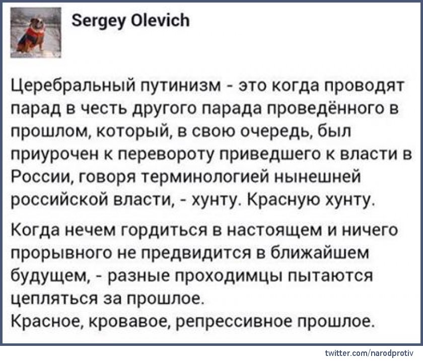нет, щас появилась новая поросль бабка рассказывает журналисту, что пришли раскулачивать, отца арестовали, их выкинули и всё такое возникает ватный историк и начинает типа такого гнать - ну, во-первых, она врёт, в 1929 году арестовывала не госбезопасность, а милиция - во-вторых, у них были не зелёные кителя, а коричневые - в-третьих, они не могли приехать на мотоцикле, так как спецотделам милиции был положен ГАЗ-А, а не мотоцикл - в четвёртых, по закону 7753, параграф 22 запрещалось избивать, так что никто её отца избить не мог - в-пятых, из дома выкинуть не могли, был закон 223344, где в части 456 говорилось, что им предоставляется жильё ....ну и похожую хуйню, после чего ватный историк подытоживает "бабка врала, ничего правдивого нет, самая вероятная версия, что её отец занимался вооружённым разбоем, а она скрывала украденное, поэтому справедливая советская власть их репрессировала"