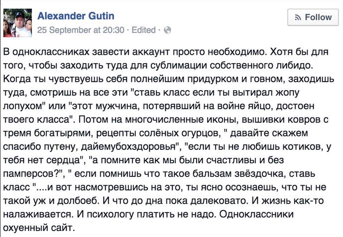 Я в одноглазниках заводил аккаунт только для того чтобы виртуально общаться с двумя возлюблимыми моей юности. Больше он мне вообще нахуй не усрасля!